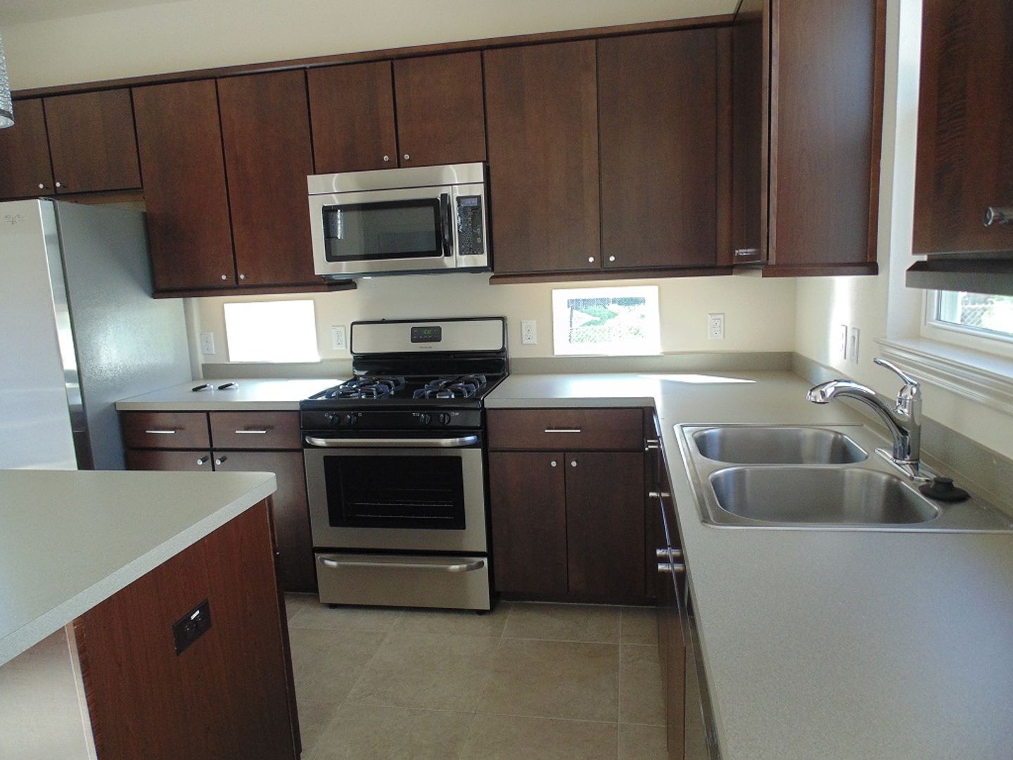 Modern house featuring wood and tile floors w/ carpet bedrooms. Spacious living room with fireplace. Kitchen has stainless appliances and dark wood cabinets. House has a two car garage and driveway for additional parking.