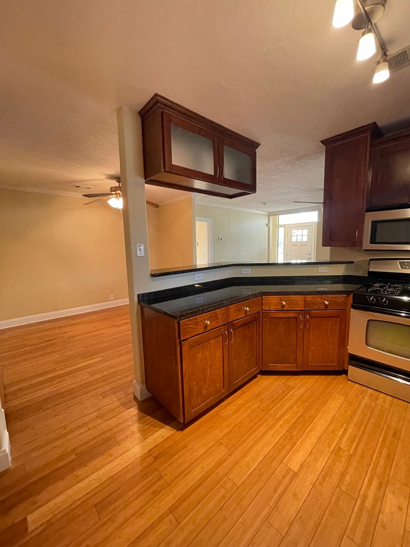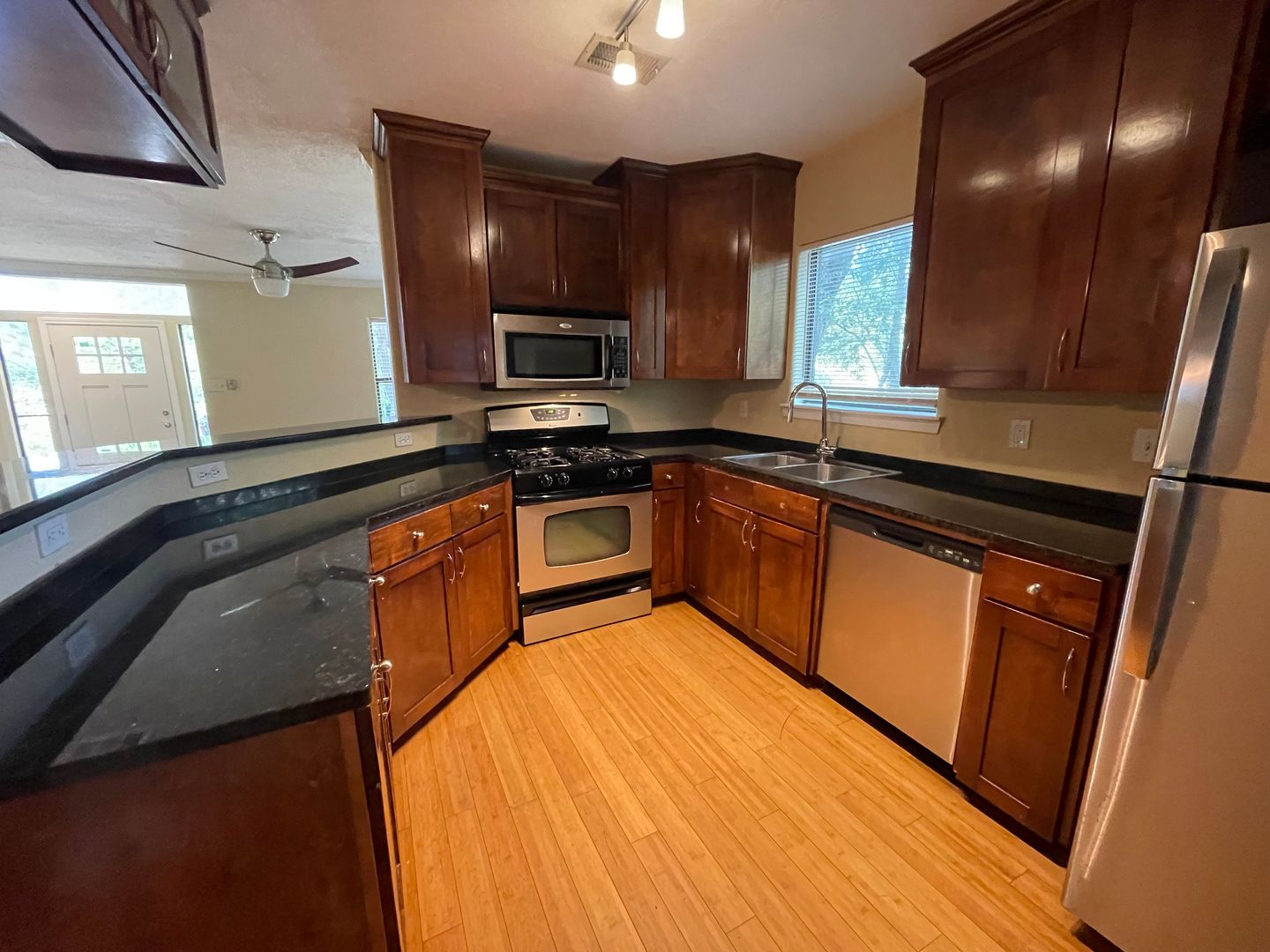 Updated house with bamboo wood floors and slate tile throughout. Living room has fireplace and dining room area. Kitchen has gas stove with stainless steel appliances and granite countertops. Large bedrooms with plenty of storage. Laundry room with washer/dryer included. Driveway has covered carport and partially fenced side yard. Blocks away from HEB and 24 Hour Fitness at the Hancock Center.