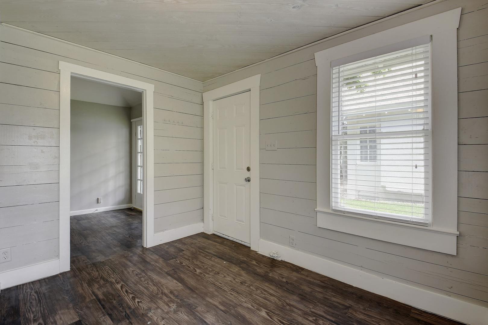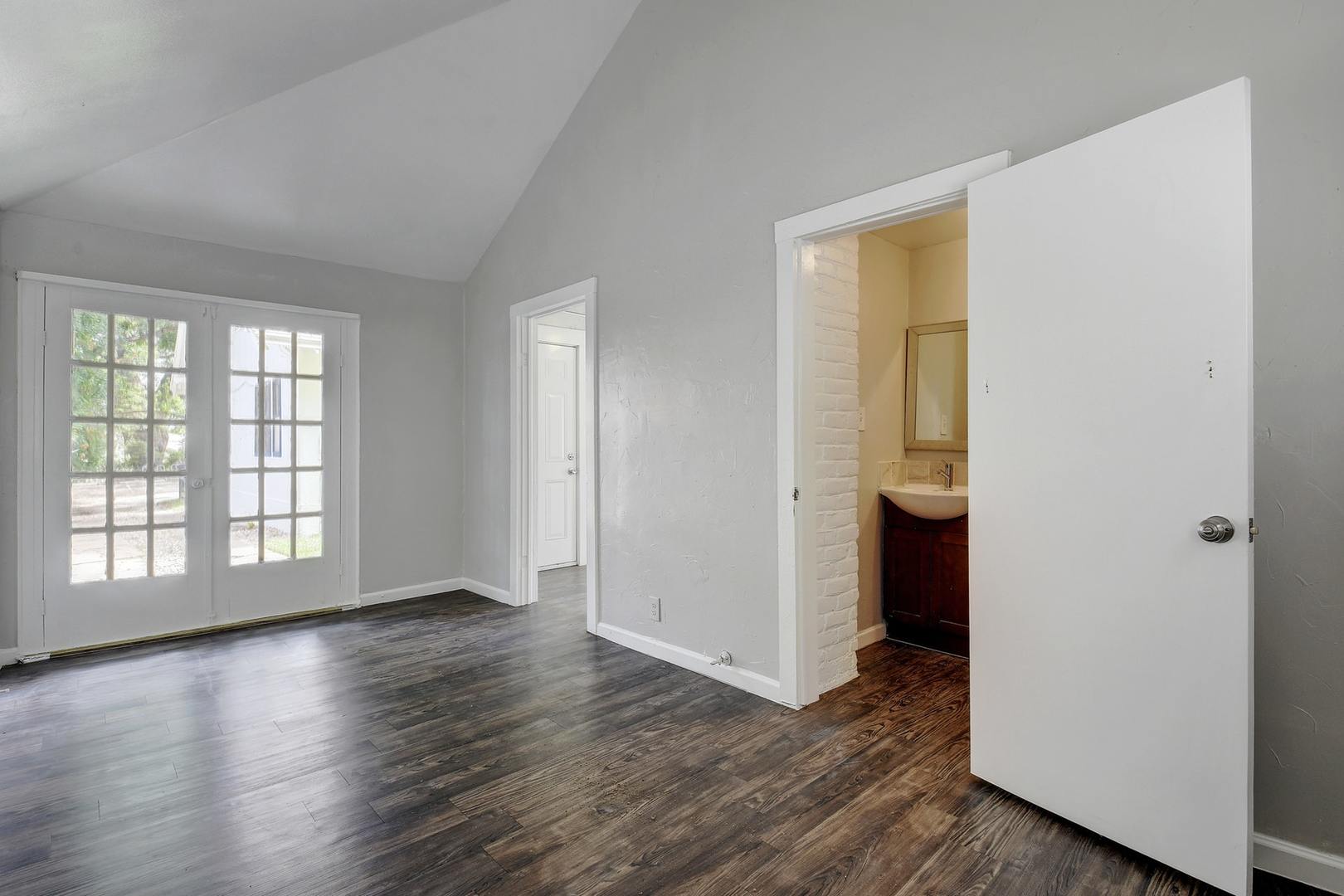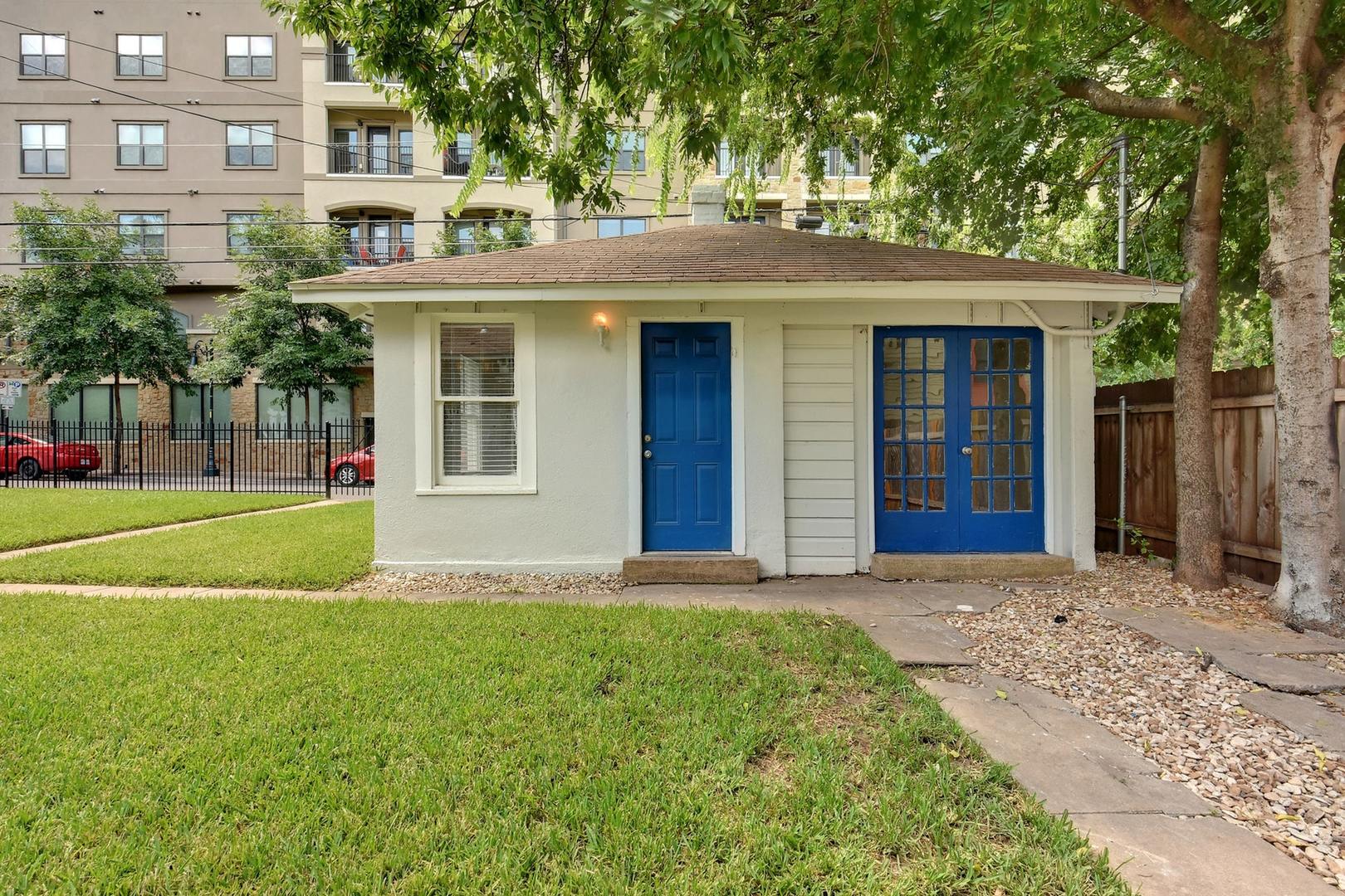 Out the back door is a private guest house with one bedroom, a bathroom, and a kitchen area, perfect for visitors or additional roommates. The property also includes a fenced yard and driveway parking.