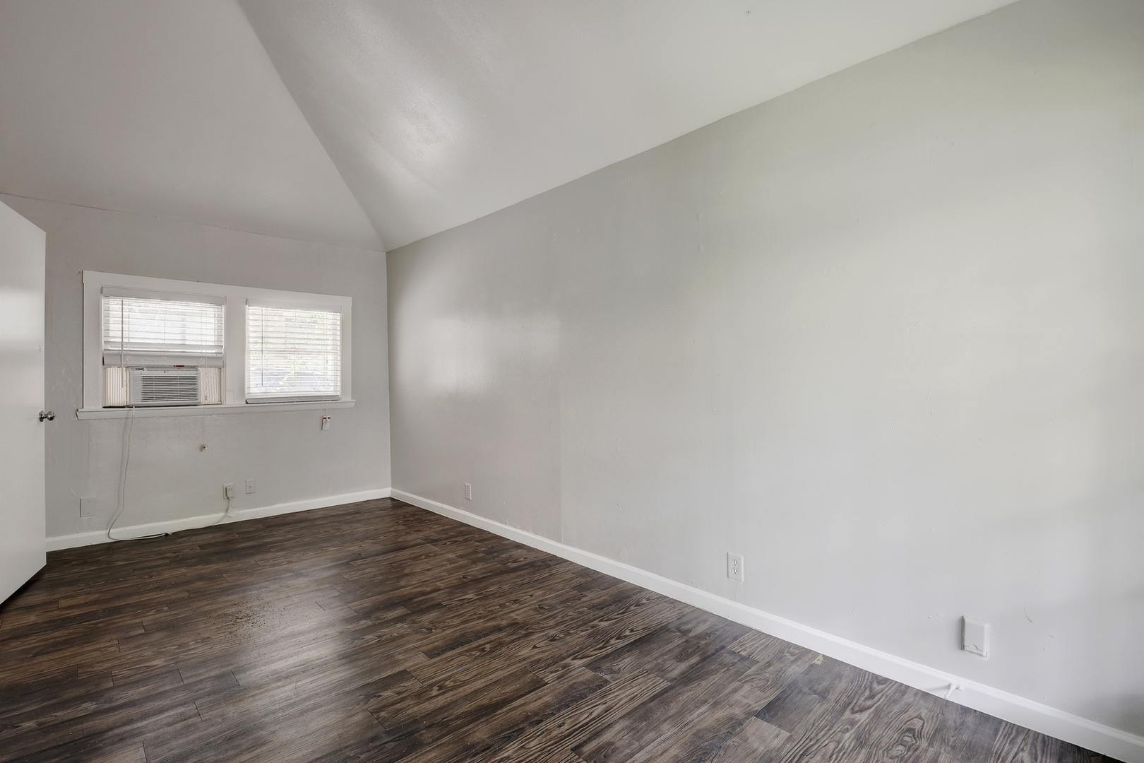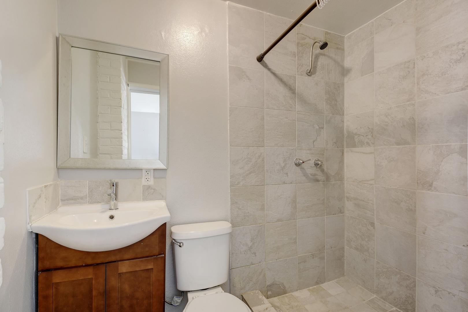 This charming property features original hardwood floors, abundant natural light, and a spacious living area with a fireplace and mounted 70” TV. The main level includes four bedrooms, one bathroom, a kitchen, and a laundry area with a stackable washer and dryer. Upstairs, the finished attic offers a large fifth bedroom with its own private bathroom and mini-split A/C unit.