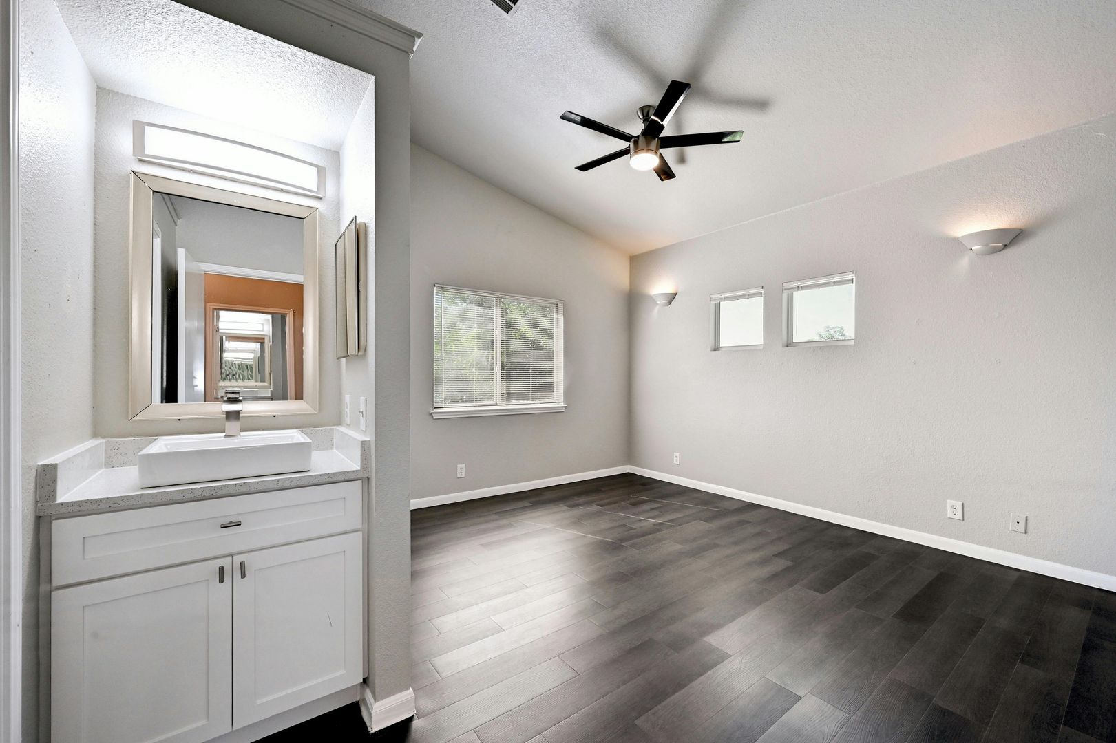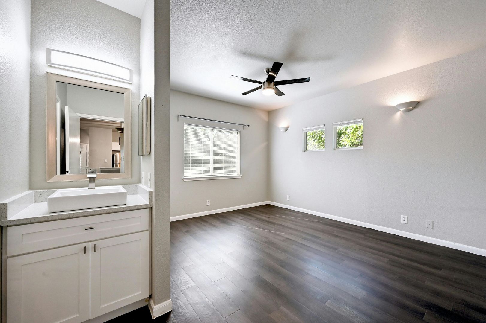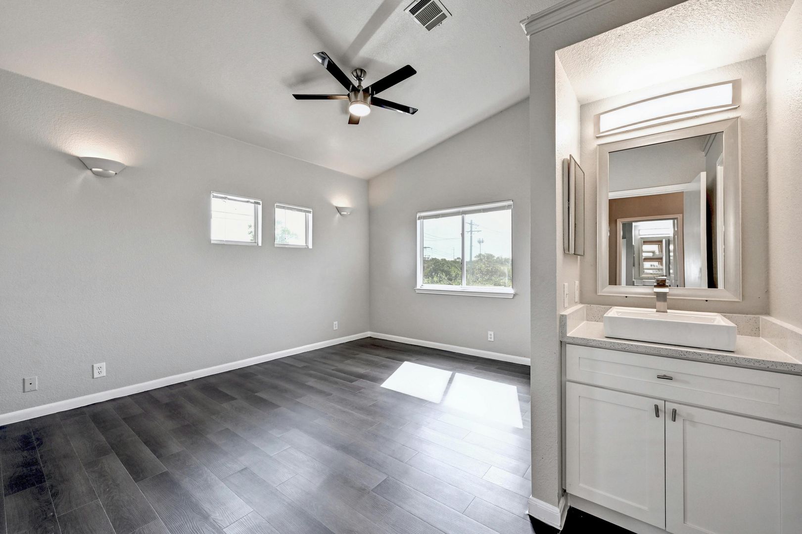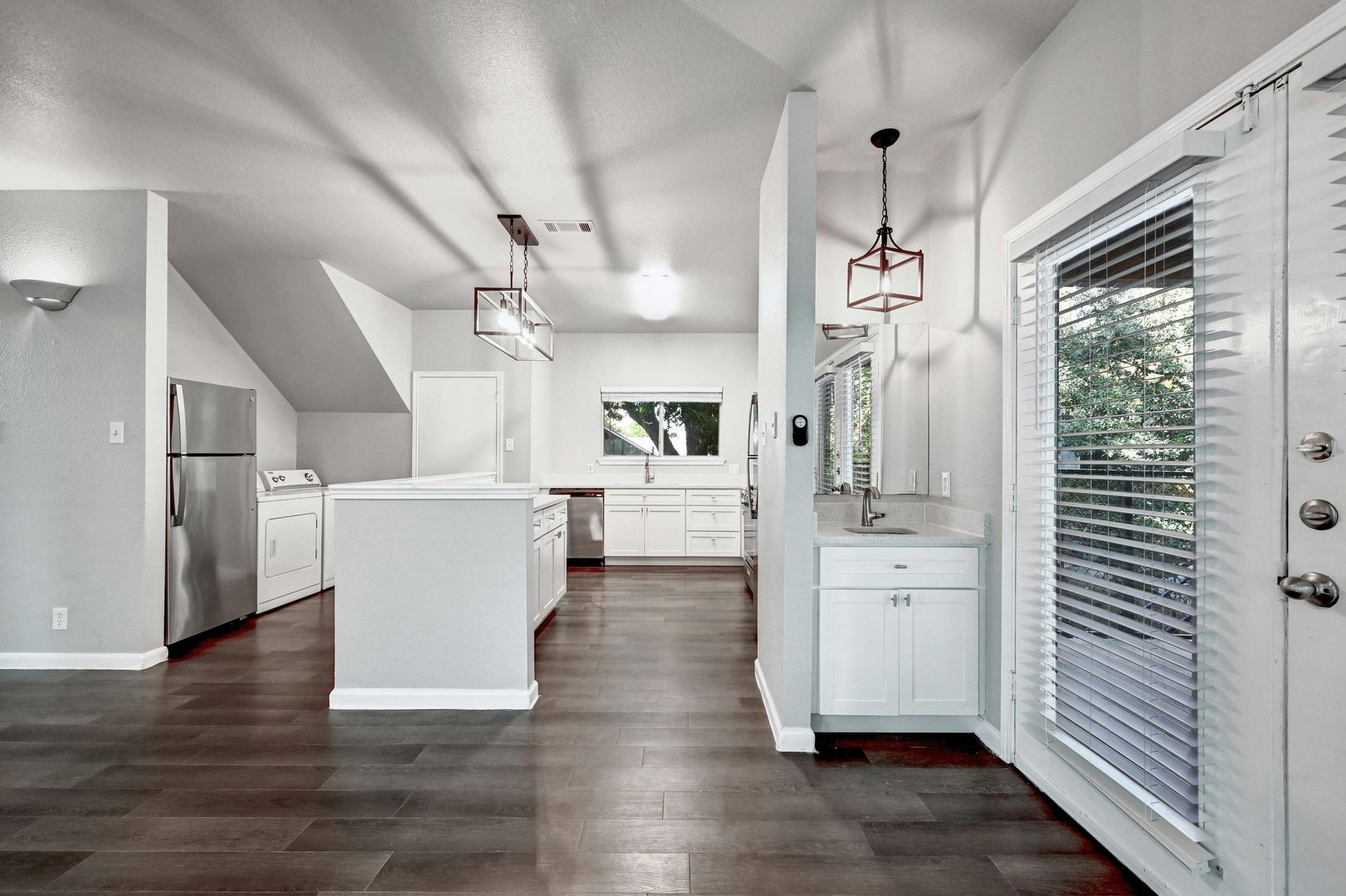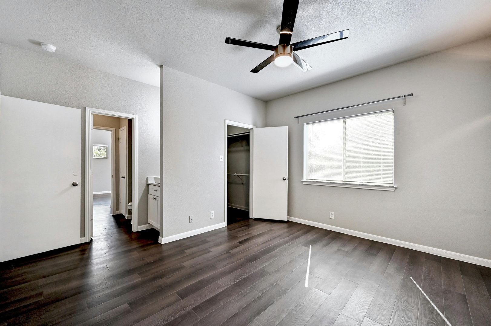 Renovated 6-bed, 3-bath duplex house in North Campus. Features vinyl wood floors throughout and updated lighting fixtures. The kitchen is equipped with stainless steel appliances, including two refrigerators, a dishwasher, a microwave, and a washer/dryer. The living room comes with an 80" TV. Each bedroom includes a large walk-in closet, a ceiling fan, and a personal vanity area with a sink, a medicine cabinet, and under-sink storage. Covered parking is available for up to six cars beneath the house.