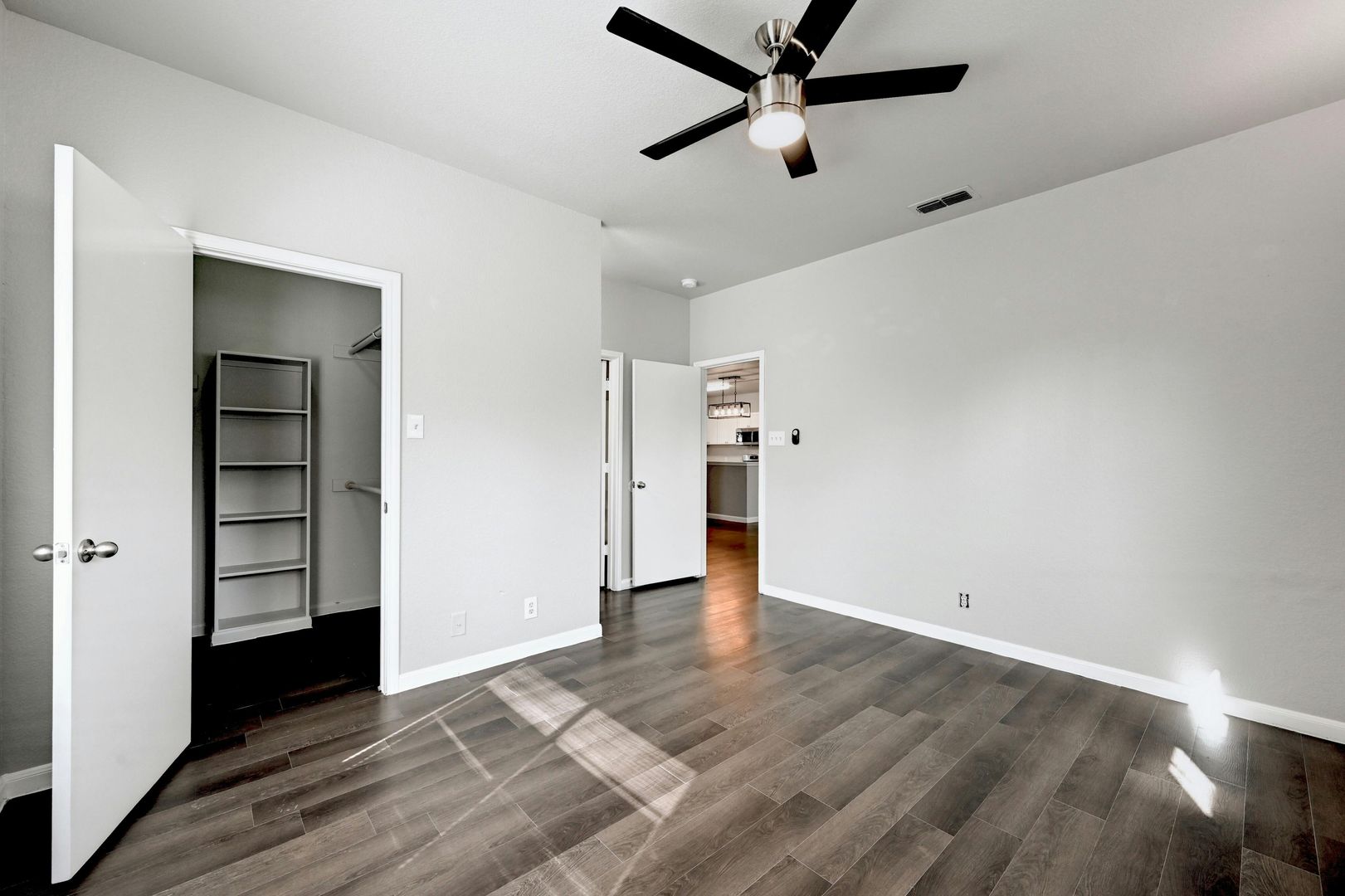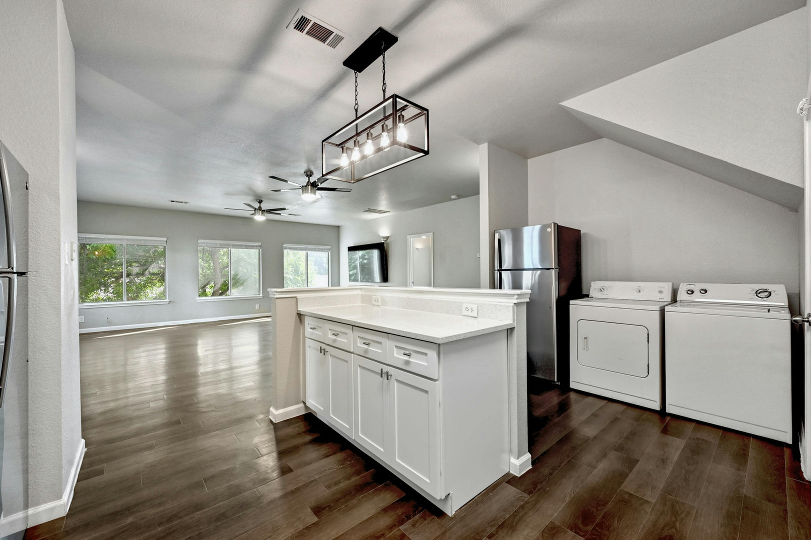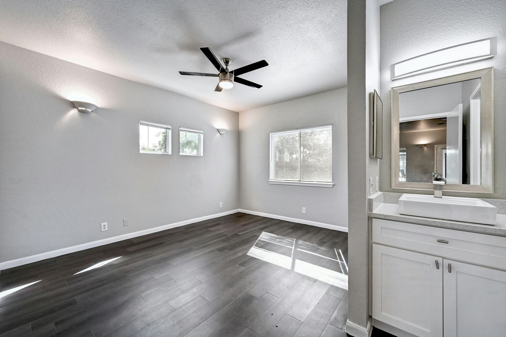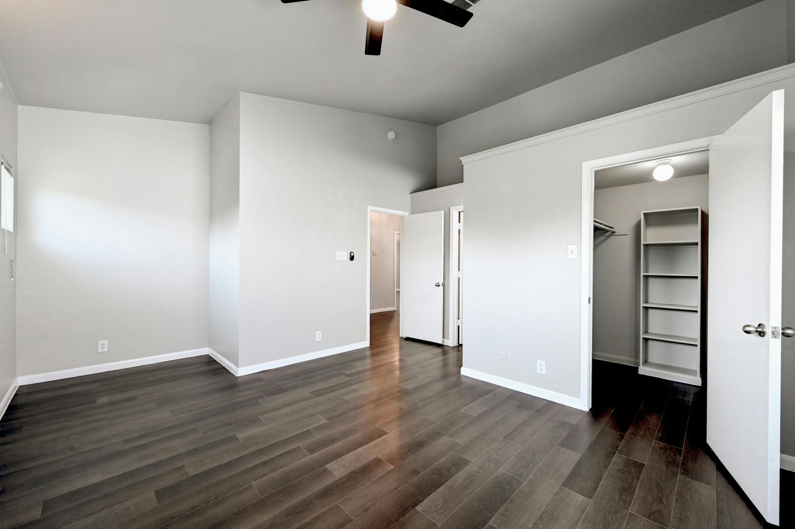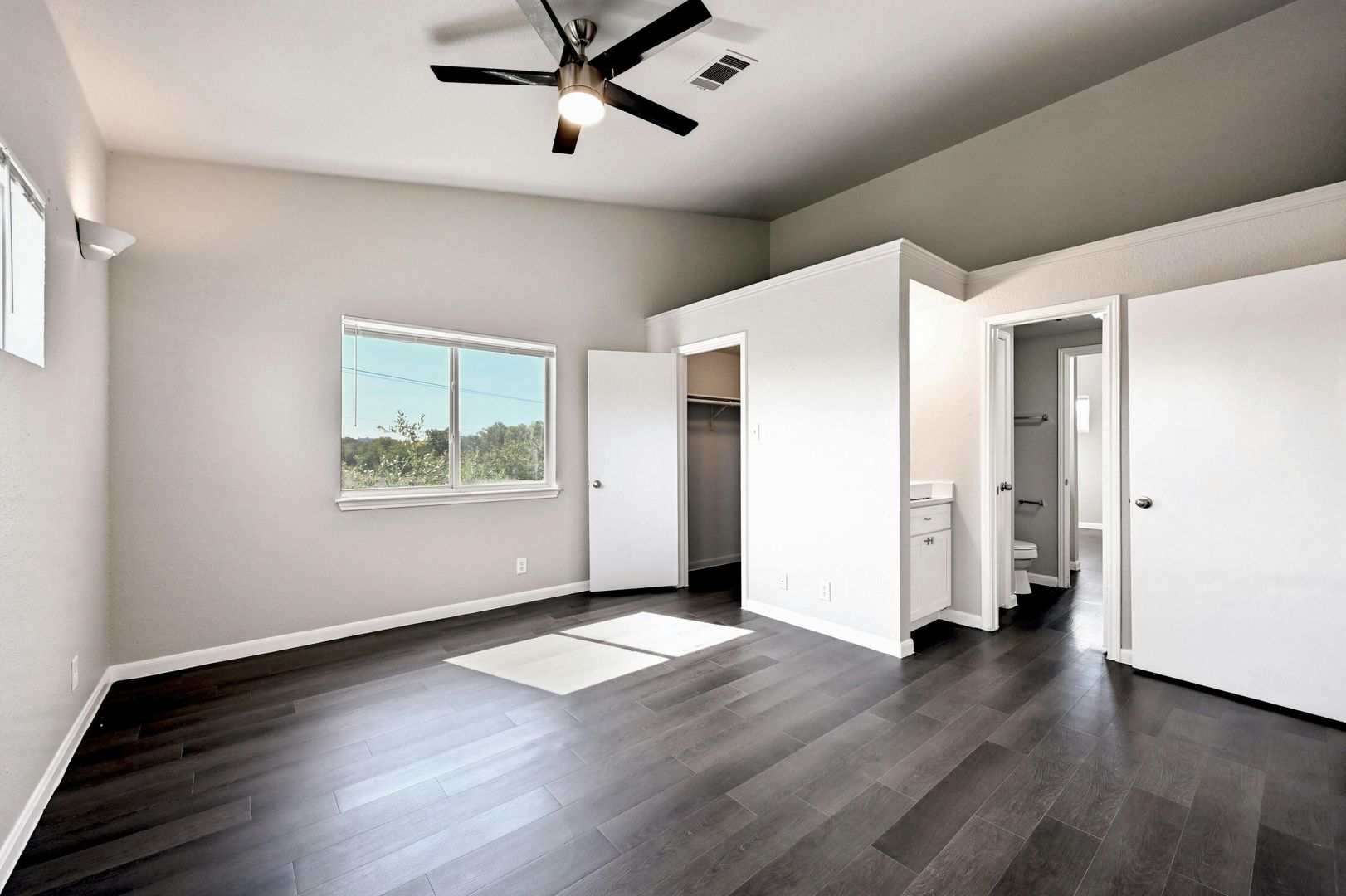 Renovated 6-bed, 3-bath duplex house in North Campus. Features vinyl wood floors throughout and updated lighting fixtures. The kitchen is equipped with stainless steel appliances, including two refrigerators, a dishwasher, a microwave, and a washer/dryer. The living room comes with an 80" TV. Each bedroom includes a large walk-in closet, a ceiling fan, and a personal vanity area with a sink, a medicine cabinet, and under-sink storage. Covered parking is available for up to six cars beneath the house.
