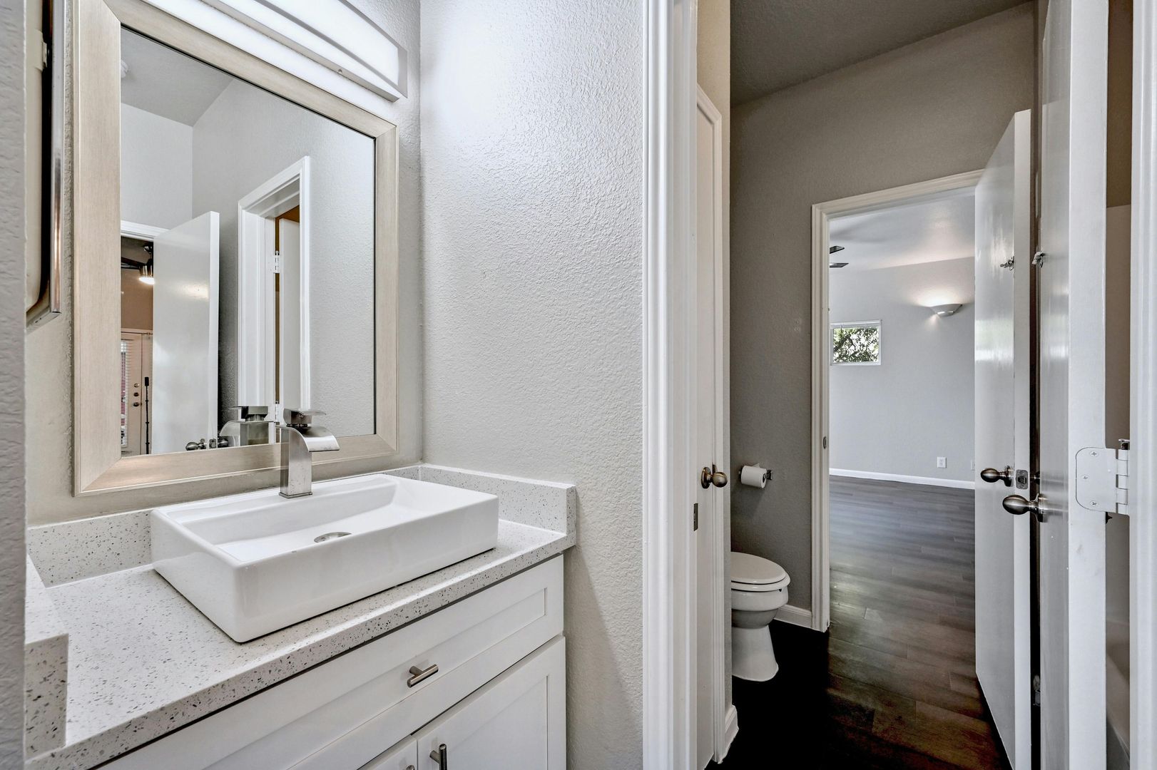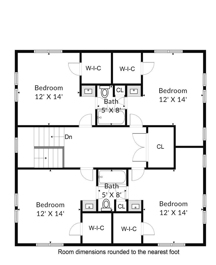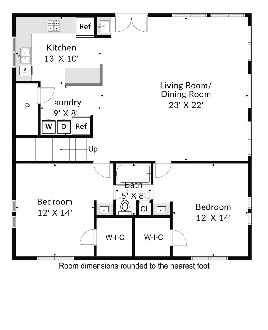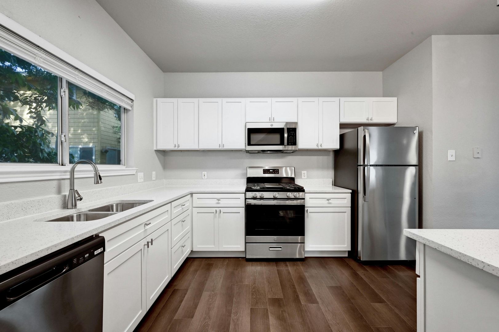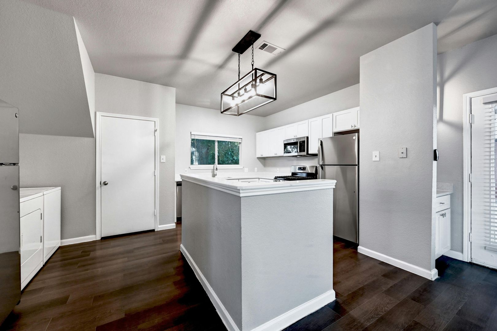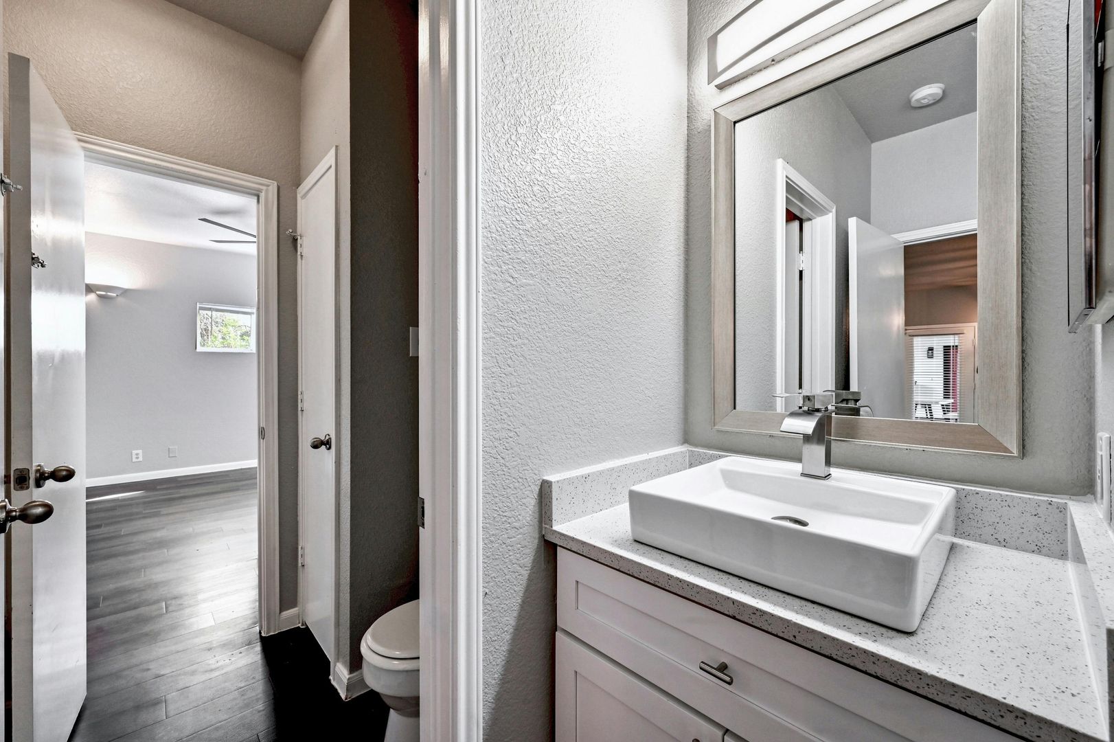 Renovated 6-bed, 3-bath duplex house in North Campus. Features vinyl wood floors throughout and updated lighting fixtures. The kitchen is equipped with stainless steel appliances, including two refrigerators, a dishwasher, a microwave, and a washer/dryer. The living room comes with an 80" TV. Each bedroom includes a large walk-in closet, a ceiling fan, and a personal vanity area with a sink, a medicine cabinet, and under-sink storage. Covered parking is available for up to six cars beneath the house.