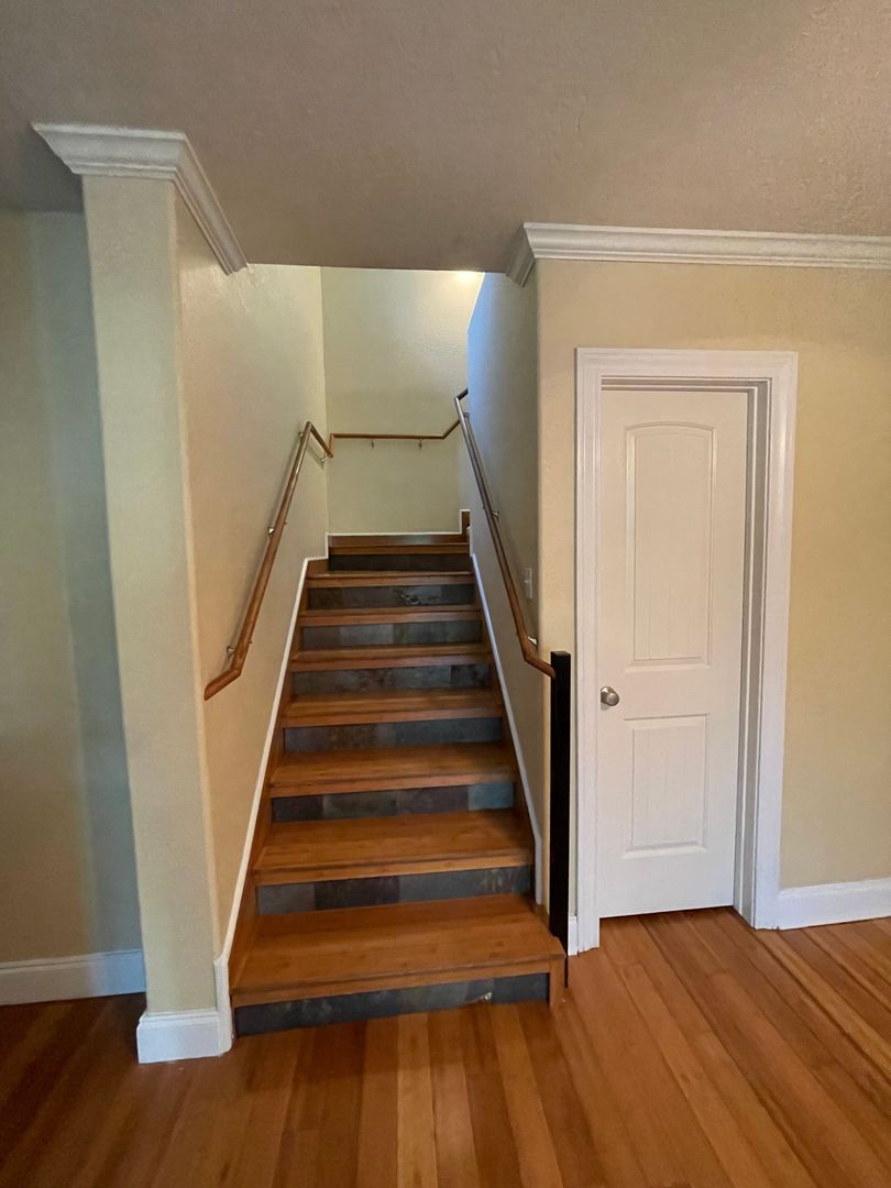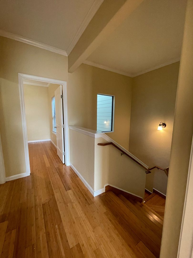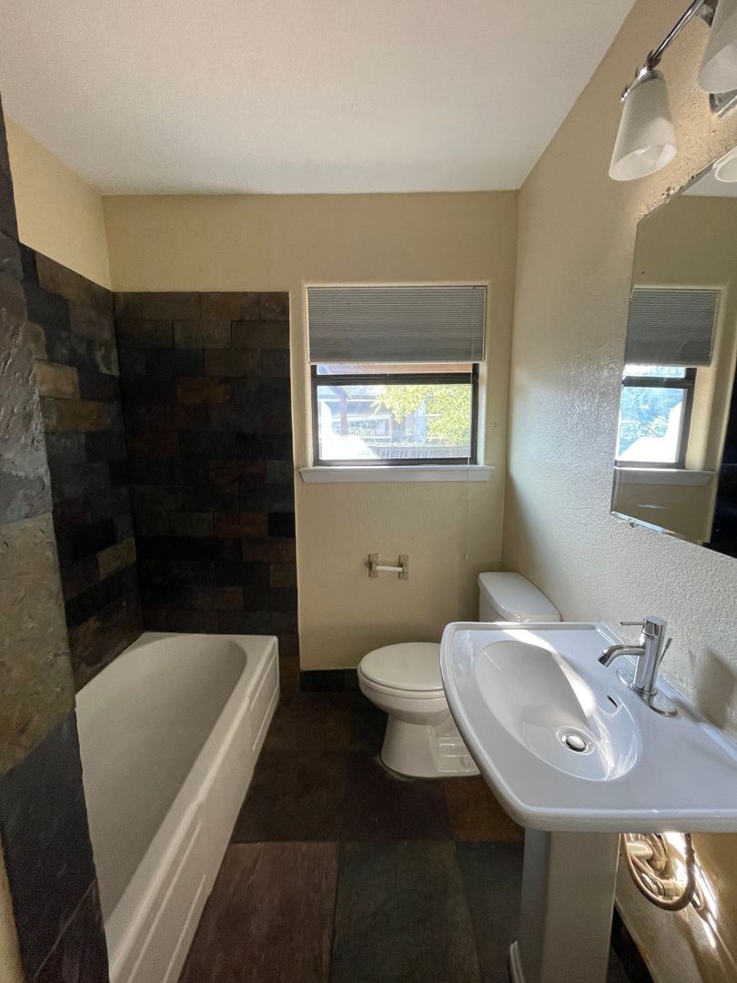 Updated house with bamboo wood floors and slate tile. Large living room with fireplace. The kitchen includes granite countertops, dark wood cabinets, stainless steel appliances, and a dining area. Downstairs has two bedrooms. One bedroom with an ensuite bathroom and another full bathroom in the hallway. Upstairs, there are two more bedrooms sharing a full bathroom, along with a laundry room with a washer and dryer. The home has plenty of storage closets throughout and a shared deck with the B unit. The driveway includes a covered carport.