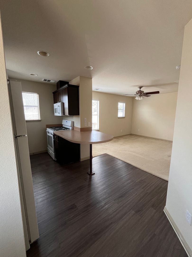 Stand alone garage apartment. Carpet in bedroom/living area and vinyl in kitchen and bath. Kitchen has gas stove, dishwasher and pantry. Stackable washer/dryer in bathroom. Unit includes 1 parking space. Garage under unit is NOT included.