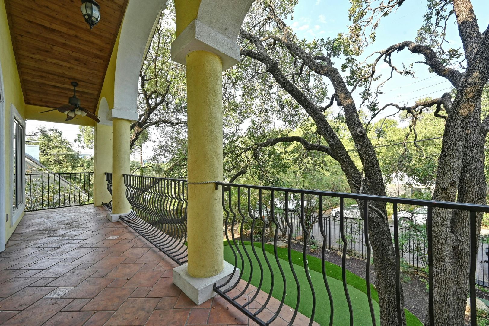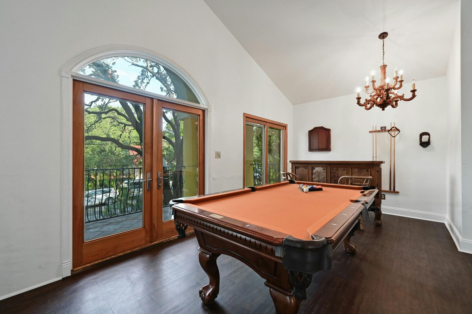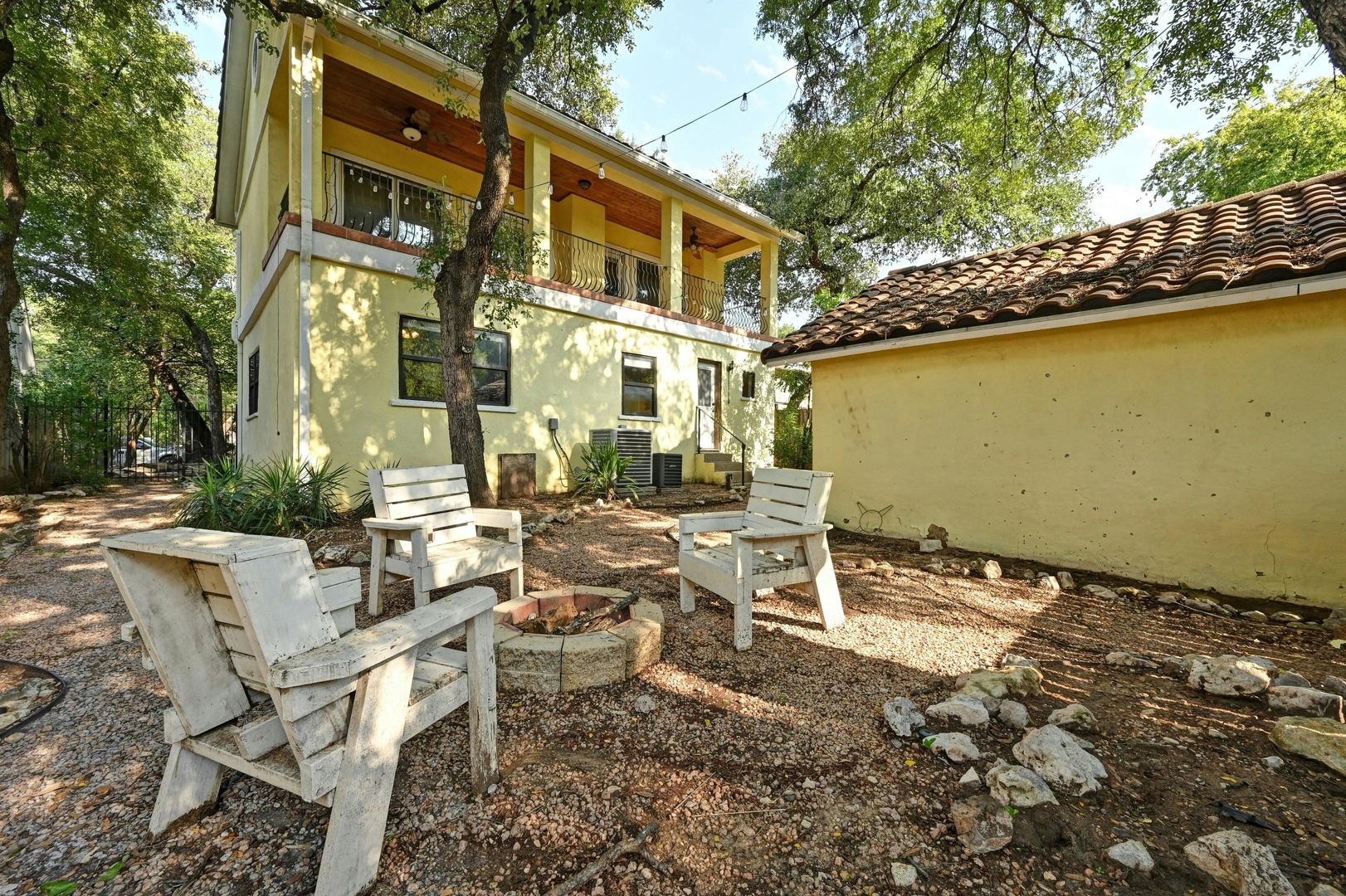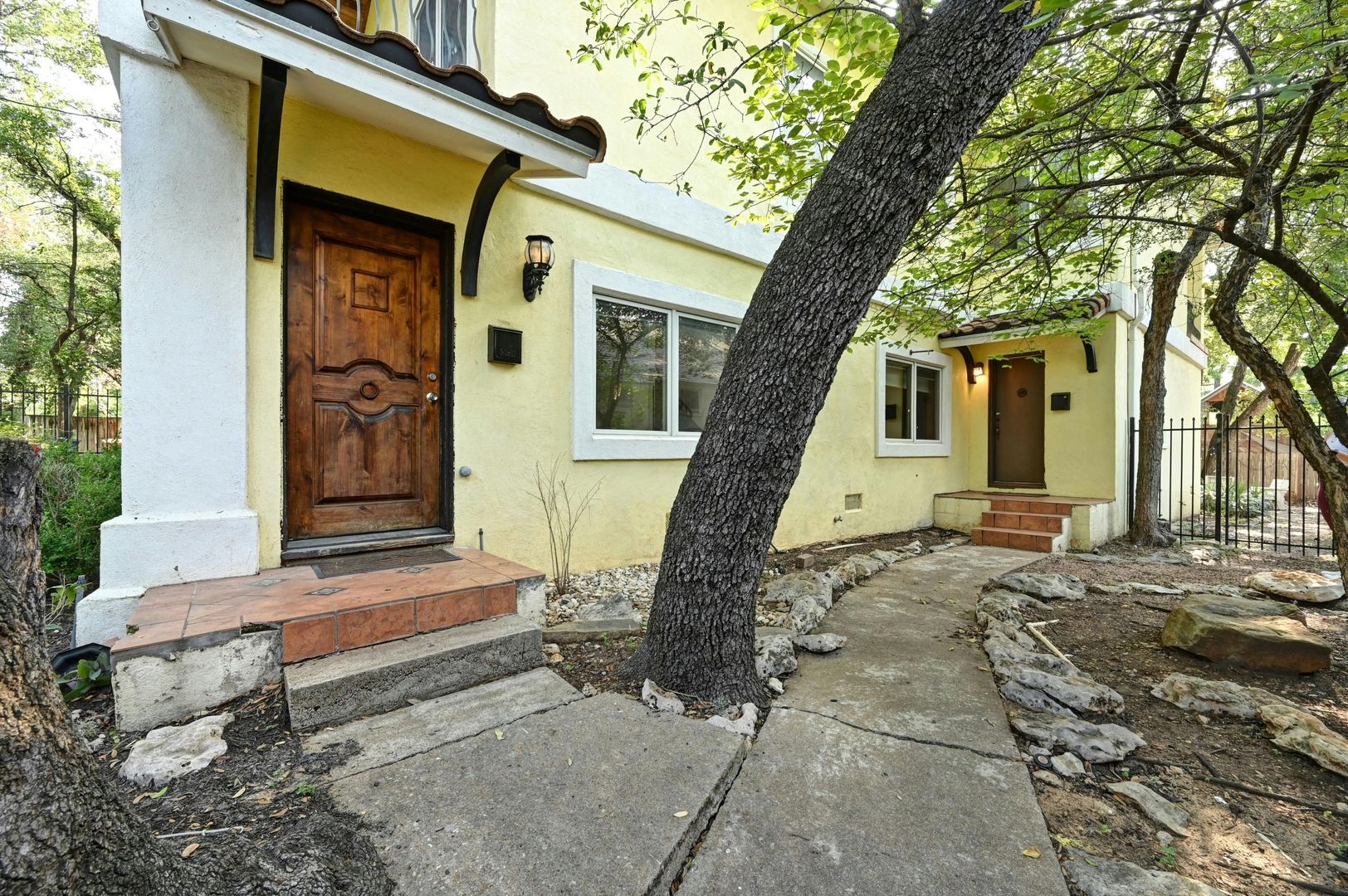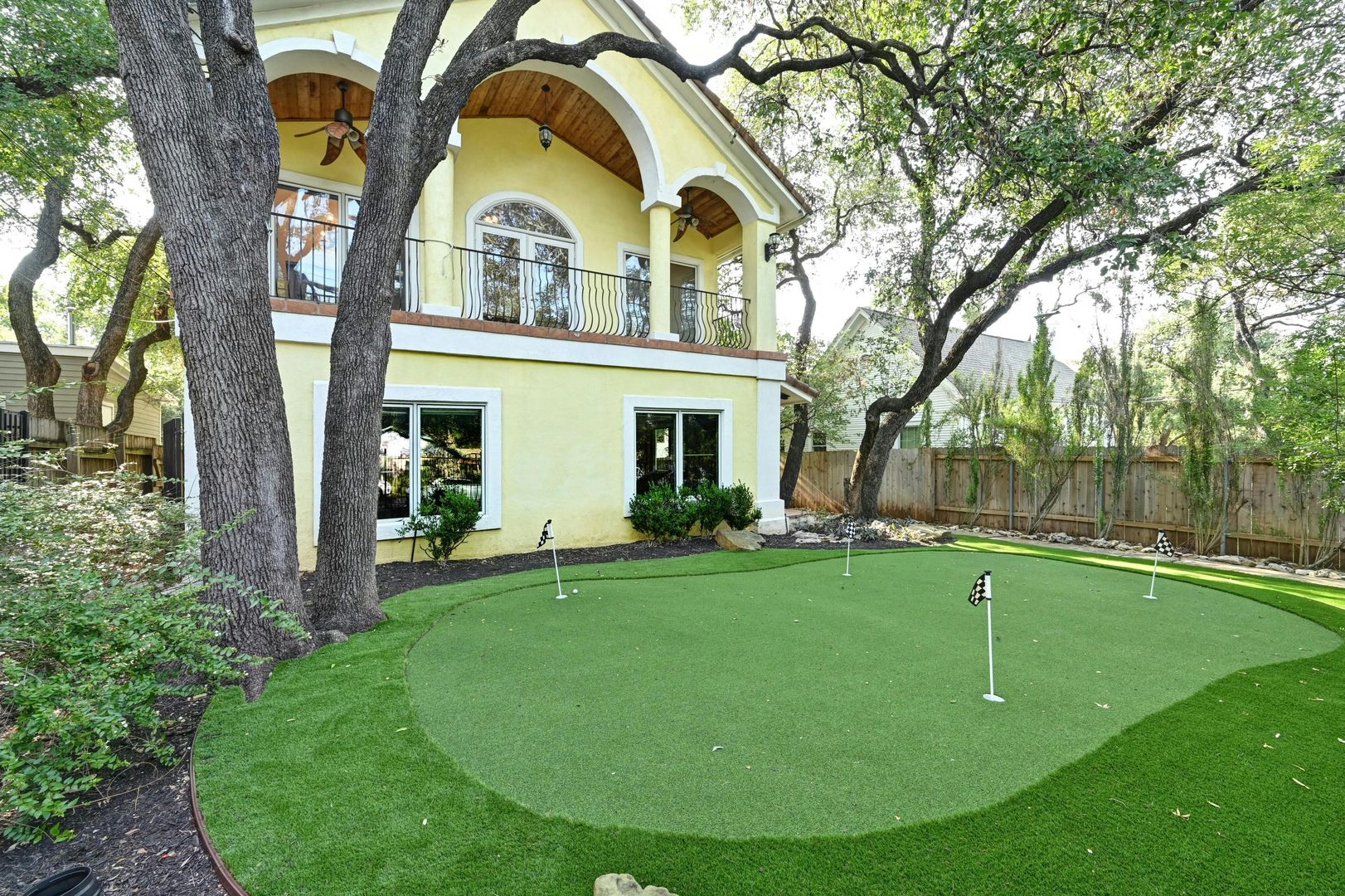 Gated property in West campus just a few blocks from UT. This property has two separate houses. The front house is 4bed/2bath with 20 ft ceilings in the living room and a bonus upstairs game room with pool table. This home has hardwood floors, two large balconies upstairs, stainless steel appliances in the kitchen and a laundry room with washer/dryer included. Large primary bedroom with walk in closet and en suite bathroom with jacuzzi bathtub and custom shower. Back house is a 2bed/1bath with a large living area, full kitchen and dining room. The property is fenced and has a two car garage with alley access. Bonus 4 hole turf putting green in the front yard.